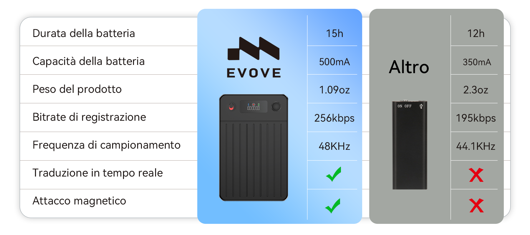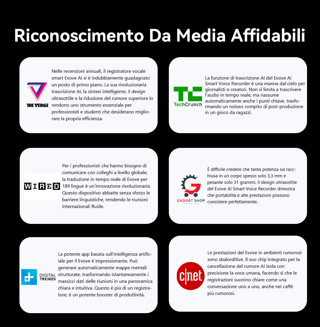 Nasce così il Registratore Vocale Intelligente AI Evove. È dotato di un potente motore AI per la trascrizione in tempo reale e il riassunto intelligente, e il suo corpo ultra-sottile include una tecnologia di cancellazione del rumore AI integrata, garantendo una qualità audio impeccabile. Questa è la promessa fondamentale di Evove: liberare la tua mente e permetterti di concentrarti su ciò che conta davvero.